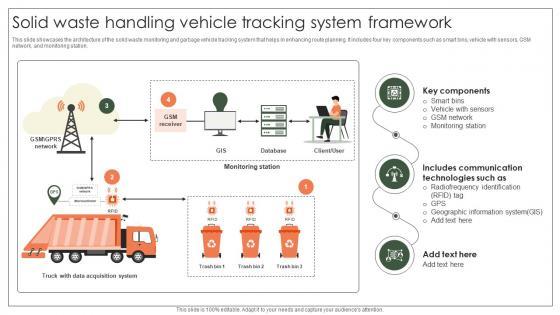 This slide showcases the architecture of the solid waste monitoring and garbage vehicle tracking system that helps in enhancing route planning. It includes four key components such as smart bins, vehicle with sensors, GSM network, and monitoring station. There are so many reasons you need a Solid Waste Handling Vehicle Tracking System Framework Implementation Of E Waste Guidelines. The first reason is you can not spend time making everything from scratch, Thus, Slidegeeks has made presentation templates for you too. You can easily download these templates from our website easily. This slide showcases the architecture of the solid waste monitoring and garbage vehicle tracking system that helps in enhancing route planning. It includes four key components such as smart bins, vehicle with sensors, GSM network, and monitoring station.
