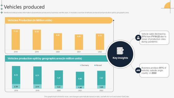 Mentioned slide provides information about vehicles produced by business over the years. It includes a number of vehicles produced and production split by geographic area.Do you have an important presentation coming up Are you looking for something that will make your presentation stand out from the rest Look no further than Vehicles Produced Automotive Manufacturing Company Profile CP SS V. With our professional designs, you can trust that your presentation will pop and make delivering it a smooth process. And with Slidegeeks, you can trust that your presentation will be unique and memorable. So why wait Grab Vehicles Produced Automotive Manufacturing Company Profile CP SS V today and make your presentation stand out from the rest Mentioned slide provides information about vehicles produced by business over the years. It includes a number of vehicles produced and production split by geographic area.