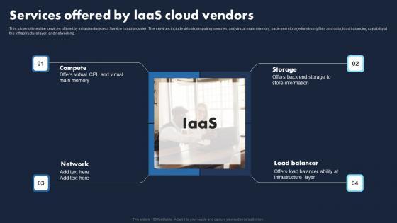 This slide outlines the services offered by Infrastructure as a Service cloud provider. The services include virtual computing services, and virtual main memory, back-end storage for storing files and data, load balancing capability at the infrastructure layer, and networking. Find highly impressive Services Offered By Laas Cloud Vendors Transforming Business With IaaS Topics Pdf on Slidegeeks to deliver a meaningful presentation. You can save an ample amount of time using these presentation templates. No need to worry to prepare everything from scratch because Slidegeeks experts have already done a huge research and work for you. You need to download Services Offered By Laas Cloud Vendors Transforming Business With IaaS Topics Pdf for your upcoming presentation. All the presentation templates are 100 percent editable and you can change the color and personalize the content accordingly. Download now This slide outlines the services offered by Infrastructure as a Service cloud provider. The services include virtual computing services, and virtual main memory, back-end storage for storing files and data, load balancing capability at the infrastructure layer, and networking.