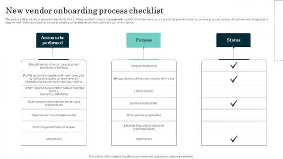 The purpose of this slide is to represent checklist to track activities involved in vendor management checklist. It includes actions such as educating vendor on terms, processes and procedures of business, providing guides to suppliers with instructions such as invoice processing, completing vendor information and payment cycles etc. Showcasing this set of slides titled New Vendor Onboarding Process Checklist Microsoft Pdf. The topics addressed in these templates are Action to be performed, Purpose, Status. All the content presented in this PPT design is completely editable. Download it and make adjustments in color, background, font etc. as per your unique business setting. The purpose of this slide is to represent checklist to track activities involved in vendor management checklist. It includes actions such as educating vendor on terms, processes and procedures of business, providing guides to suppliers with instructions such as invoice processing, completing vendor information and payment cycles etc.