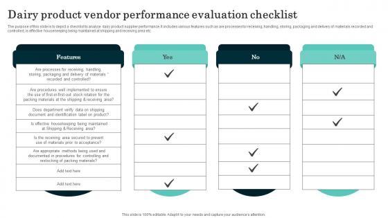 The purpose of this slide is to depict a checklist to analyze dairy product supplier performance. It includes various features such as are processes for receiving, handling, storing, packaging and delivery of materials recorded and controlled, is effective housekeeping being maintained at shipping and receiving area etc. Showcasing this set of slides titled Dairy Product Vendor Performance Evaluation Checklist Inspiration Pdf. The topics addressed in these templates are Features, performance evaluation. All the content presented in this PPT design is completely editable. Download it and make adjustments in color, background, font etc. as per your unique business setting. The purpose of this slide is to depict a checklist to analyze dairy product supplier performance. It includes various features such as are processes for receiving, handling, storing, packaging and delivery of materials recorded and controlled, is effective housekeeping being maintained at shipping and receiving area etc.