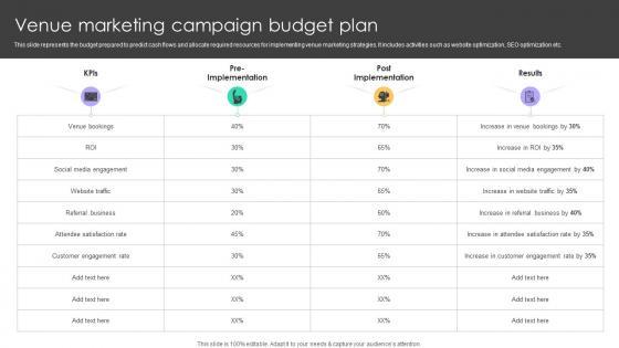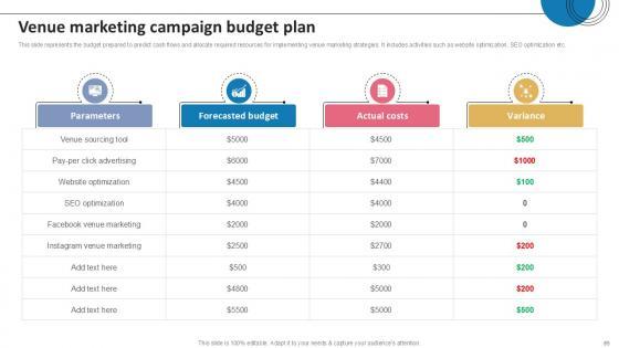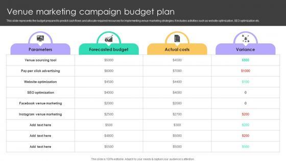 This slide represents the budget prepared to predict cash flows and allocate required resources for implementing venue marketing strategies. It includes activities such as website optimization, SEO optimization etc. Find a pre-designed and impeccable Venue Marketing Campaign Budget Plan Online Venue Advertising Plan Strategy SS V. The templates can ace your presentation without additional effort. You can download these easy-to-edit presentation templates to make your presentation stand out from others. So, what are you waiting for Download the template from Slidegeeks today and give a unique touch to your presentation. This slide represents the budget prepared to predict cash flows and allocate required resources for implementing venue marketing strategies. It includes activities such as website optimization, SEO optimization etc.