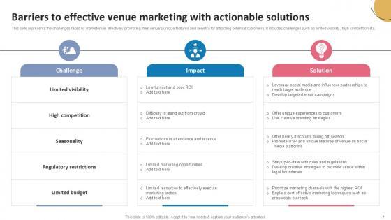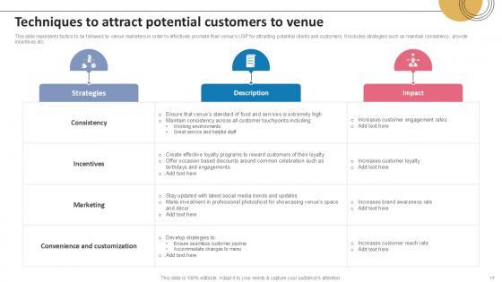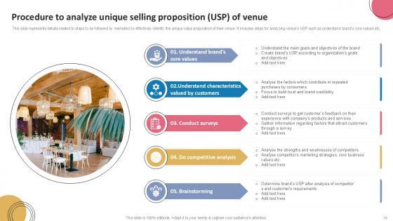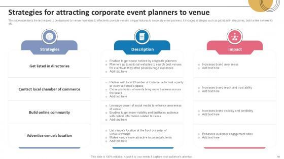 Presenting this set of slides with name venue proposal template ppt powerpoint presentation complete deck with slides. The topics discussed in these slides are business, management, planning, strategy, marketing. This is a completely editable PowerPoint presentation and is available for immediate download. Download now and impress your audience.