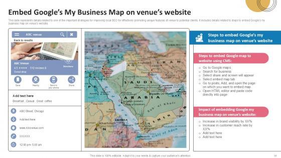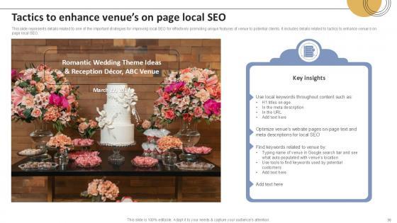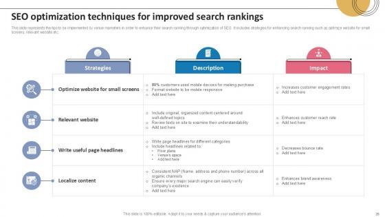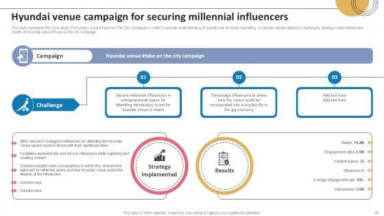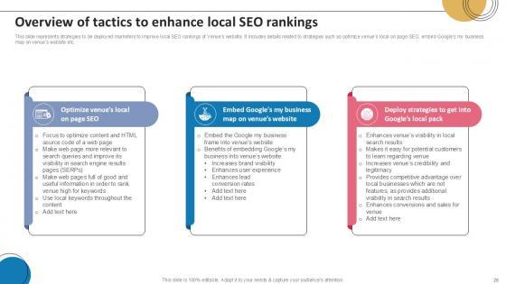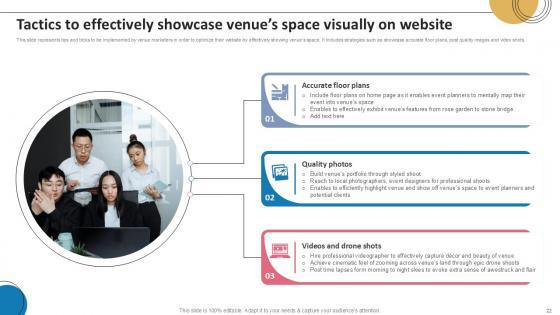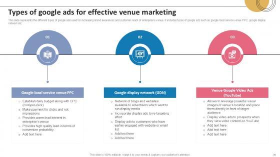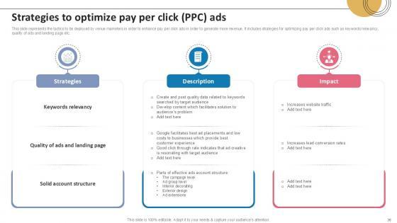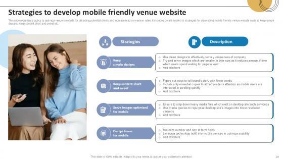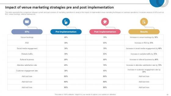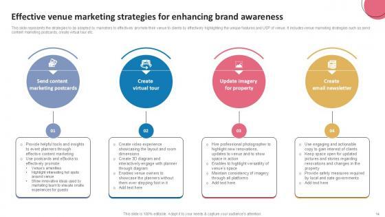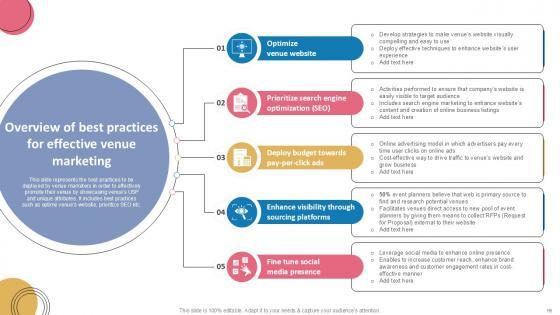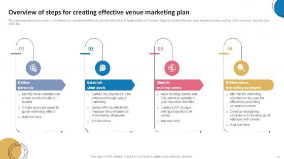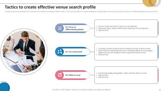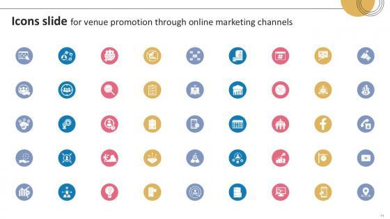This Venue Promotion Through Online Marketing Channels Ppt Sample Strategy CD V is a primer on how to capitalize on business opportunities through planning, innovation, and market intelligence. The content-ready format of the complete deck will make your job as a decision-maker a lot easier. Use this ready-made PowerPoint Template to help you outline an extensive and legible plan to capture markets and grow your company on the right path, at an exponential pace. What is even more amazing is that this presentation is completely editable and 100 percent customizable. This seventy eight-slide complete deck helps you impress a roomful of people with your expertise in business and even presentation. Craft such a professional and appealing presentation for that amazing recall value. Download now. Our Venue Promotion Through Online Marketing Channels Ppt Sample Strategy CD V are topically designed to provide an attractive backdrop to any subject. Use them to look like a presentation pro.