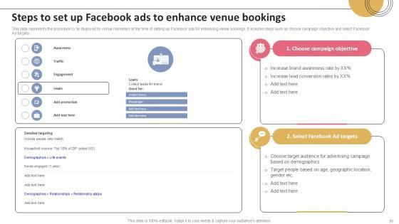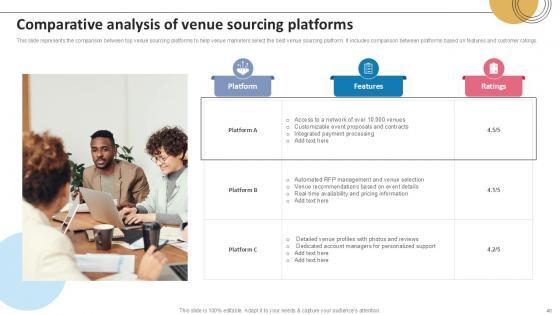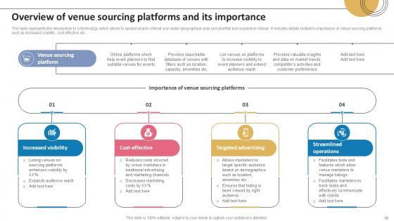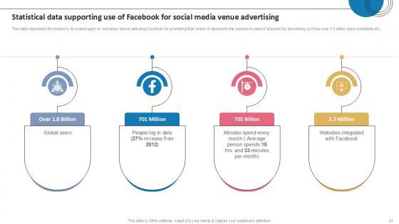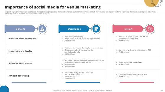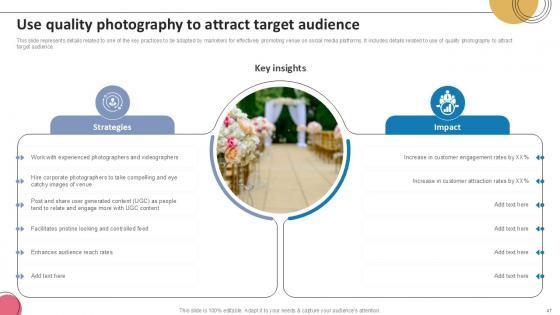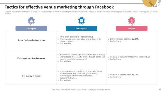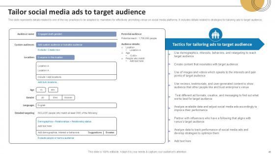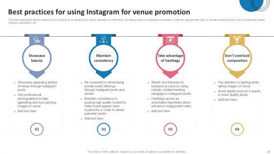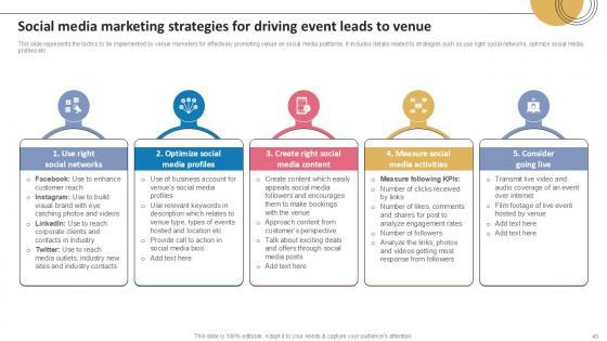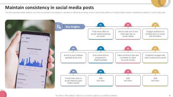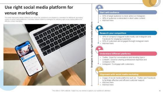 This slide represents details related to one of the key practices to be adopted by marketers for effectively promoting venue on social media platforms. It includes details related to strategies for selecting right social media platform for effective venue marketing. Get a simple yet stunning designed Online Venue Advertising Plan Use Right Social Media Platform For Venue Marketing Strategy SS V. It is the best one to establish the tone in your meetings. It is an excellent way to make your presentations highly effective. So, download this PPT today from Slidegeeks and see the positive impacts. Our easy-to-edit Online Venue Advertising Plan Use Right Social Media Platform For Venue Marketing Strategy SS V can be your go-to option for all upcoming conferences and meetings. So, what are you waiting for Grab this template today. This slide represents details related to one of the key practices to be adopted by marketers for effectively promoting venue on social media platforms. It includes details related to strategies for selecting right social media platform for effective venue marketing.