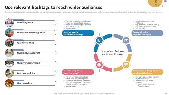 This slide represents details related to one of the key practices to be adopted by marketers for effectively promoting venue on social media platforms. It includes details related to strategies for finding best performing hashtags. Do you have to make sure that everyone on your team knows about any specific topic I yes, then you should give Online Venue Advertising Plan Use Relevant Hashtags To Reach Wider Audiences Strategy SS V a try. Our experts have put a lot of knowledge and effort into creating this impeccable Online Venue Advertising Plan Use Relevant Hashtags To Reach Wider Audiences Strategy SS V. You can use this template for your upcoming presentations, as the slides are perfect to represent even the tiniest detail. You can download these templates from the Slidegeeks website and these are easy to edit. So grab these today This slide represents details related to one of the key practices to be adopted by marketers for effectively promoting venue on social media platforms. It includes details related to strategies for finding best performing hashtags.