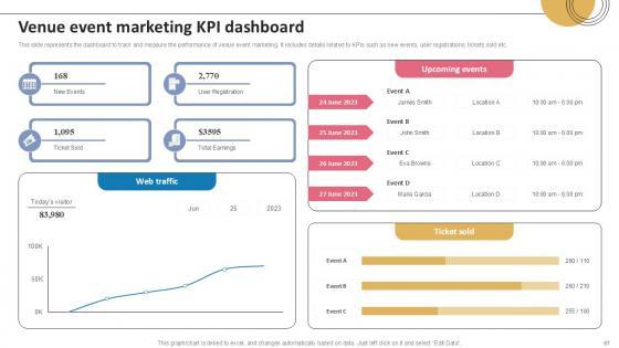 This slide represents the dashboard to track and measure the performance of venue event marketing. It includes details related to KPIs such as new events, user registrations, tickets sold etc. Present like a pro with Online Venue Advertising Plan Venue Event Marketing Kpi Dashboard Strategy SS V. Create beautiful presentations together with your team, using our easy-to-use presentation slides. Share your ideas in real-time and make changes on the fly by downloading our templates. So whether you are in the office, on the go, or in a remote location, you can stay in sync with your team and present your ideas with confidence. With Slidegeeks presentation got a whole lot easier. Grab these presentations today. This slide represents the dashboard to track and measure the performance of venue event marketing. It includes details related to KPIs such as new events, user registrations, tickets sold etc.