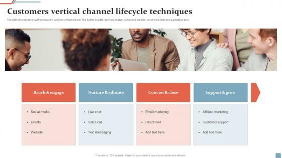 This slide showcases lifecycle techniques in customer vertical channel. This further includes reach and engage, nurture and educate, convert and close and support and grow. Showcasing this set of slides titled Customers Vertical Channel Lifecycle Techniques Ppt Professional Example Pdf. The topics addressed in these templates are Reach And Engage, Nurture And Educate, Convert And Close. All the content presented in this PPT design is completely editable. Download it and make adjustments in color, background, font etc. as per your unique business setting. This slide showcases lifecycle techniques in customer vertical channel. This further includes reach and engage, nurture and educate, convert and close and support and grow.