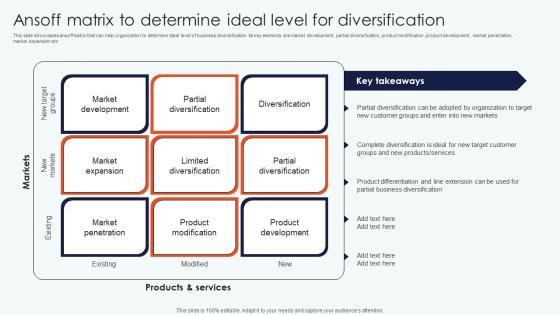 This slide showcases ansoff matrix that can help organization to determine ideal level of business diversification. Its key elements are market development, partial diversification, product modification, product development, market penetration, market expansion etc There are so many reasons you need a Ansoff Matrix Determine Leveraging Horizontal Vertical Diversification Entering Professional Pdf. The first reason is you can not spend time making everything from scratch, Thus, Slidegeeks has made presentation templates for you too. You can easily download these templates from our website easily. This slide showcases ansoff matrix that can help organization to determine ideal level of business diversification. Its key elements are market development, partial diversification, product modification, product development, market penetration, market expansion etc