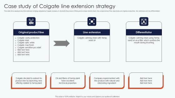 This slide showcases product line extension strategy adopted by Colgate company to diversify the product offering and increase market share. Key components of this case study are original product line, line extension and key differentiation Get a simple yet stunning designed Case Study Colgate Line Extension Leveraging Horizontal Vertical Diversification Entering Mockup Pdf. It is the best one to establish the tone in your meetings. It is an excellent way to make your presentations highly effective. So, download this PPT today from Slidegeeks and see the positive impacts. Our easy to edit Case Study Colgate Line Extension Leveraging Horizontal Vertical Diversification Entering Mockup Pdf can be your go to option for all upcoming conferences and meetings. So, what are you waiting for Grab this template today. This slide showcases product line extension strategy adopted by Colgate company to diversify the product offering and increase market share. Key components of this case study are original product line, line extension and key differentiation