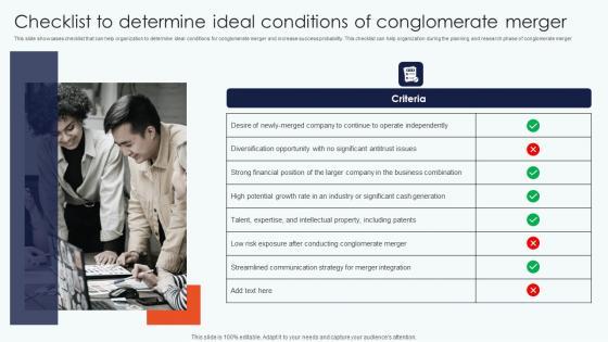 This slide showcases checklist that can help organization to determine ideal conditions for conglomerate merger and increase success probability. This checklist can help organization during the planning and research phase of conglomerate merger Present like a pro with Checklist To Determine Ideal Conditions Leveraging Horizontal Vertical Diversification Entering Template Pdf Create beautiful presentations together with your team, using our easy to use presentation slides. Share your ideas in real time and make changes on the fly by downloading our templates. So whether you are in the office, on the go, or in a remote location, you can stay in sync with your team and present your ideas with confidence. With Slidegeeks presentation got a whole lot easier. Grab these presentations today. This slide showcases checklist that can help organization to determine ideal conditions for conglomerate merger and increase success probability. This checklist can help organization during the planning and research phase of conglomerate merger