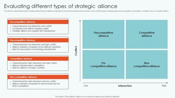 This slide showcases different types of strategic alliance that can initiated by organization to diversify the business risk and increase revenue. Different types of strategic alliance are procompetitive, precompetitive, competitive and non competitive alliance Do you have an important presentation coming up Are you looking for something that will make your presentation stand out from the rest Look no further than Evaluating Different Types Strategic Leveraging Horizontal Vertical Diversification Entering Download Pdf. With our professional designs, you can trust that your presentation will pop and make delivering it a smooth process. And with Slidegeeks, you can trust that your presentation will be unique and memorable. So why wait Grab Evaluating Different Types Strategic Leveraging Horizontal Vertical Diversification Entering Download Pdf today and make your presentation stand out from the rest This slide showcases different types of strategic alliance that can initiated by organization to diversify the business risk and increase revenue. Different types of strategic alliance are procompetitive, precompetitive, competitive and non competitive alliance
