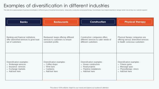 This slide showcases example of business diversification in different types of industries that are banks, restaurants, construction and physical therapy. Diversification have helped industries to manage market risk and tap new customer segment If your project calls for a presentation, then Slidegeeks is your go to partner because we have professionally designed, easy to edit templates that are perfect for any presentation. After downloading, you can easily edit Examples Diversification Different Leveraging Horizontal Vertical Diversification Entering Rules Pdf and make the changes accordingly. You can rearrange slides or fill them with different images. Check out all the handy templates This slide showcases example of business diversification in different types of industries that are banks, restaurants, construction and physical therapy. Diversification have helped industries to manage market risk and tap new customer segment
