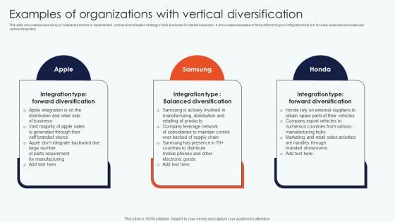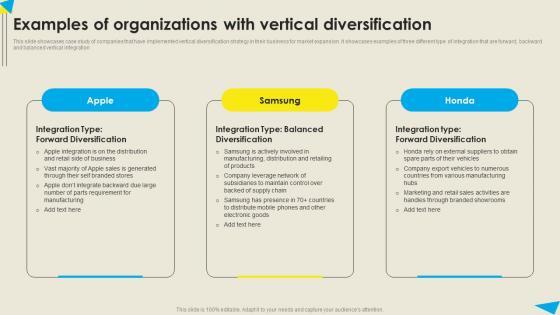 This slide showcases case study of companies that have implemented vertical diversification strategy in their business for market expansion. It showcases examples of three different type of integration that are forward, backward and balanced vertical integration Are you in need of a template that can accommodate all of your creative concepts This one is crafted professionally and can be altered to fit any style. Use it with Google Slides or PowerPoint. Include striking photographs, symbols, depictions, and other visuals. Fill, move around, or remove text boxes as desired. Test out color palettes and font mixtures. Edit and save your work, or work with colleagues. Download Examples Organizations Vertical Leveraging Horizontal Vertical Diversification Entering Themes Pdf and observe how to make your presentation outstanding. Give an impeccable presentation to your group and make your presentation unforgettable. This slide showcases case study of companies that have implemented vertical diversification strategy in their business for market expansion. It showcases examples of three different type of integration that are forward, backward and balanced vertical integration