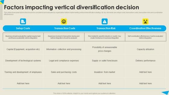 This slide showcases factors that should be considered and evaluated by organization before implementing vertical diversification strategy. Its key elements are setups costs, transaction costs, transaction risks and coordination effectiveness Formulating a presentation can take up a lot of effort and time, so the content and message should always be the primary focus. The visuals of the PowerPoint can enhance the presenters message, so our Factors Impacting Vertical Leveraging Horizontal Vertical Diversification Entering Background Pdf was created to help save time. Instead of worrying about the design, the presenter can concentrate on the message while our designers work on creating the ideal templates for whatever situation is needed. Slidegeeks has experts for everything from amazing designs to valuable content, we have put everything into Factors Impacting Vertical Leveraging Horizontal Vertical Diversification Entering Background Pdf This slide showcases factors that should be considered and evaluated by organization before implementing vertical diversification strategy. Its key elements are setups costs, transaction costs, transaction risks and coordination effectiveness
