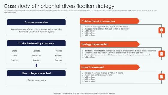 This slide showcases example of horizontal diversification that have helped organization to launch new product and increase market share. Key components of this case study are problem statement, strategy implemented, company overview and impact assessment From laying roadmaps to briefing everything in detail, our templates are perfect for you. You can set the stage with your presentation slides. All you have to do is download these easy to edit and customizable templates. Case Study Horizontal Diversification Leveraging Horizontal Vertical Diversification Entering Inspiration Pdf will help you deliver an outstanding performance that everyone would remember and praise you for. Do download this presentation today. This slide showcases example of horizontal diversification that have helped organization to launch new product and increase market share. Key components of this case study are problem statement, strategy implemented, company overview and impact assessment