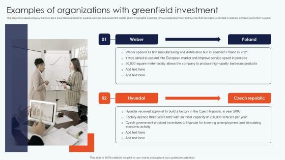 This slide showcases company that have done greenfield investment to expand overseas and expand the market share. It highlights examples of two companies Weber and Hyundai that have done greenfield investment in Poland and Czech Republic. Are you in need of a template that can accommodate all of your creative concepts This one is crafted professionally and can be altered to fit any style. Use it with Google Slides or PowerPoint. Include striking photographs, symbols, depictions, and other visuals. Fill, move around, or remove text boxes as desired. Test out color palettes and font mixtures. Edit and save your work, or work with colleagues. Download Leveraging Horizontal Vertical Diversification Entering Examples Organizations Greenfield Rules Pdf and observe how to make your presentation outstanding. Give an impeccable presentation to your group and make your presentation unforgettable. This slide showcases company that have done greenfield investment to expand overseas and expand the market share. It highlights examples of two companies Weber and Hyundai that have done greenfield investment in Poland and Czech Republic