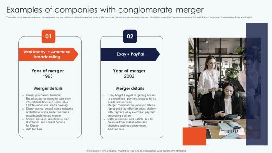 This slide showcases examples of conglomerate merger that have helped companies to diversify business risk and increase brand presence. It highlights example of various companies like Walt Disney, American Broadcasting, Ebay and PayPal. If your project calls for a presentation, then Slidegeeks is your go to partner because we have professionally designed, easy to edit templates that are perfect for any presentation. After downloading, you can easily edit Examples Companies Conglomerate Leveraging Horizontal Vertical Diversification Examples Companies Conglomerate Topics Pdf and make the changes accordingly. You can rearrange slides or fill them with different images. Check out all the handy templates This slide showcases examples of conglomerate merger that have helped companies to diversify business risk and increase brand presence. It highlights example of various companies like Walt Disney, American Broadcasting, Ebay and PayPal