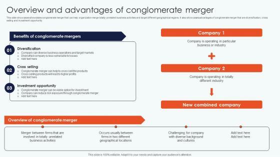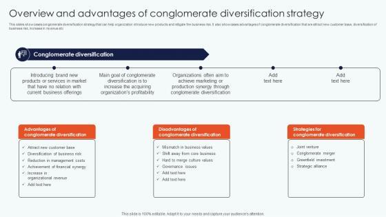 This slides showcases conglomerate diversification strategy that can help organization introduce new products and mitigate the business risk. It also showcases advantages of conglomerate diversification that are attract new customer base, diversification of business risk, increase in revenue etc Do you know about Slidesgeeks Overview And Advantages Conglomerate Leveraging Horizontal Vertical Diversification Entering Information Pdf These are perfect for delivering any kind od presentation. Using it, create PowerPoint presentations that communicate your ideas and engage audiences. Save time and effort by using our pre designed presentation templates that are perfect for a wide range of topic. Our vast selection of designs covers a range of styles, from creative to business, and are all highly customizable and easy to edit. Download as a PowerPoint template or use them as Google Slides themes. This slides showcases conglomerate diversification strategy that can help organization introduce new products and mitigate the business risk. It also showcases advantages of conglomerate diversification that are attract new customer base, diversification of business risk, increase in revenue etc