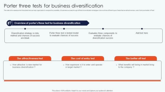 This slide showcases porter three tests that can help organization to analyse the possibility of business success through different diversification strategies. It shows three different type of tests that are attractiveness, cost of entry and better off test Want to ace your presentation in front of a live audience Our Porter Three Tests Business Leveraging Horizontal Vertical Diversification Entering Clipart Pdf can help you do that by engaging all the users towards you. Slidegeeks experts have put their efforts and expertise into creating these impeccable powerpoint presentations so that you can communicate your ideas clearly. Moreover, all the templates are customizable, and easy to edit and downloadable. Use these for both personal and commercial use. This slide showcases porter three tests that can help organization to analyse the possibility of business success through different diversification strategies. It shows three different type of tests that are attractiveness, cost of entry and better off test