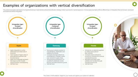 This slide showcases case study of companies that have implemented vertical diversification strategy in their business for market expansion. It showcases examples of three different type of integration that are forward, backward and balanced vertical integration. Are you in need of a template that can accommodate all of your creative concepts This one is crafted professionally and can be altered to fit any style. Use it with Google Slides or PowerPoint. Include striking photographs, symbols, depictions, and other visuals. Fill, move around, or remove text boxes as desired. Test out color palettes and font mixtures. Edit and save your work, or work with colleagues. Download Examples Of Organizations With Vertical Diversification Strategic Diversification Plan Template PDF and observe how to make your presentation outstanding. Give an impeccable presentation to your group and make your presentation unforgettable. This slide showcases case study of companies that have implemented vertical diversification strategy in their business for market expansion. It showcases examples of three different type of integration that are forward, backward and balanced vertical integration.