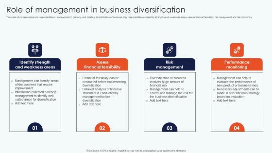 This slide showcases roles and responsibilities of management in planning and initiating diversification of business. Key responsibilities are identify strengths and weakness areas, assess financial feasibility, risk management and risk monitoring Get a simple yet stunning designed Role Management Business Leveraging Horizontal Vertical Diversification Entering Slides Pdf. It is the best one to establish the tone in your meetings. It is an excellent way to make your presentations highly effective. So, download this PPT today from Slidegeeks and see the positive impacts. Our easy to edit Role Management Business Leveraging Horizontal Vertical Diversification Entering Slides Pdf can be your go to option for all upcoming conferences and meetings. So, what are you waiting for Grab this template today. This slide showcases roles and responsibilities of management in planning and initiating diversification of business. Key responsibilities are identify strengths and weakness areas, assess financial feasibility, risk management and risk monitoring