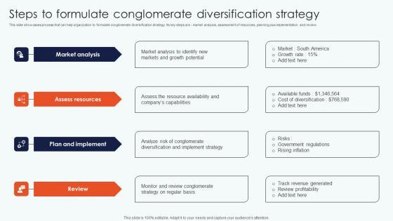 This slide showcases process that can help organization to formulate conglomerate diversification strategy. Its key steps are market analysis, assessment of resources, planning plus implementation and review From laying roadmaps to briefing everything in detail, our templates are perfect for you. You can set the stage with your presentation slides. All you have to do is download these easy to edit and customizable templates. Steps Formulate Conglomerate Leveraging Horizontal Vertical Diversification Entering Guidelines Pdf will help you deliver an outstanding performance that everyone would remember and praise you for. Do download this presentation today. This slide showcases process that can help organization to formulate conglomerate diversification strategy. Its key steps are market analysis, assessment of resources, planning plus implementation and review