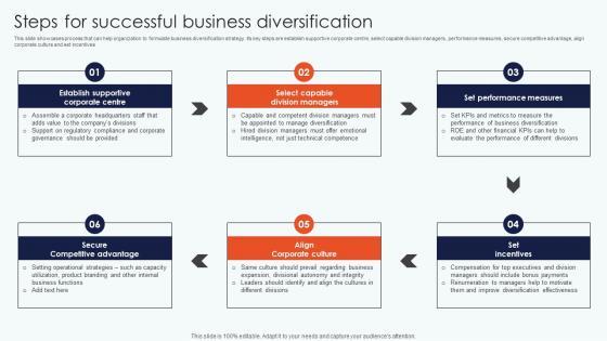 This slide showcases process that can help organization to formulate business diversification strategy. Its key steps are establish supportive corporate centre, select capable division managers, performance measures, secure competitive advantage, align corporate culture and set incentives Present like a pro with Steps Successful Business Leveraging Horizontal Vertical Diversification Entering Introduction Pdf Create beautiful presentations together with your team, using our easy to use presentation slides. Share your ideas in real time and make changes on the fly by downloading our templates. So whether you are in the office, on the go, or in a remote location, you can stay in sync with your team and present your ideas with confidence. With Slidegeeks presentation got a whole lot easier. Grab these presentations today. This slide showcases process that can help organization to formulate business diversification strategy. Its key steps are establish supportive corporate centre, select capable division managers, performance measures, secure competitive advantage, align corporate culture and set incentives