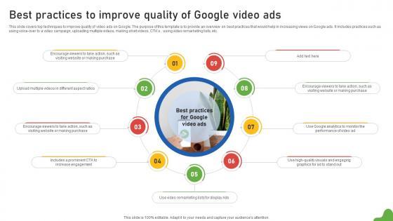 This slide covers top techniques to improve quality of video ads on Google. The purpose of this template is to provide an overview on best practices that would help in increasing views on Google ads. It includes practices such as using voice-over to a video campaign, uploading multiple videos, making short videos, CTAs , using video remarketing lists, etc. Want to ace your presentation in front of a live audience Our A65 Google Ads Categories Best Practices To Improve Quality Of Google Video Ads MKT SS V can help you do that by engaging all the users towards you. Slidegeeks experts have put their efforts and expertise into creating these impeccable powerpoint presentations so that you can communicate your ideas clearly. Moreover, all the templates are customizable, and easy-to-edit and downloadable. Use these for both personal and commercial use. This slide covers top techniques to improve quality of video ads on Google. The purpose of this template is to provide an overview on best practices that would help in increasing views on Google ads. It includes practices such as using voice-over to a video campaign, uploading multiple videos, making short videos, CTAs , using video remarketing lists, etc.