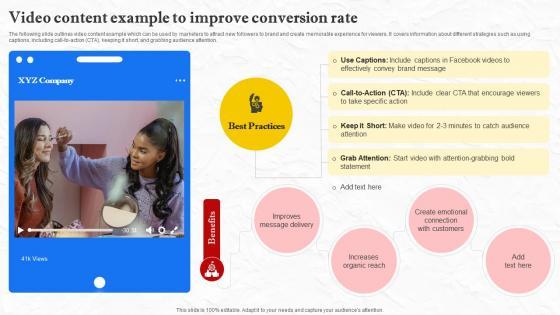 The following slide outlines video content example which can be used by marketers to attract new followers to brand and create memorable experience for viewers. It covers information about different strategies such as using captions, including call-to-action CTA , keeping it short, and grabbing audience attention. Crafting an eye-catching presentation has never been more straightforward. Let your presentation shine with this tasteful yet straightforward Facebook Marketing Techniques Video Content Example To Improve Conversion Rate Strategy SS V template. It offers a minimalistic and classy look that is great for making a statement. The colors have been employed intelligently to add a bit of playfulness while still remaining professional. Construct the ideal Facebook Marketing Techniques Video Content Example To Improve Conversion Rate Strategy SS V that effortlessly grabs the attention of your audience Begin now and be certain to wow your customers The following slide outlines video content example which can be used by marketers to attract new followers to brand and create memorable experience for viewers. It covers information about different strategies such as using captions, including call-to-action CTA , keeping it short, and grabbing audience attention.