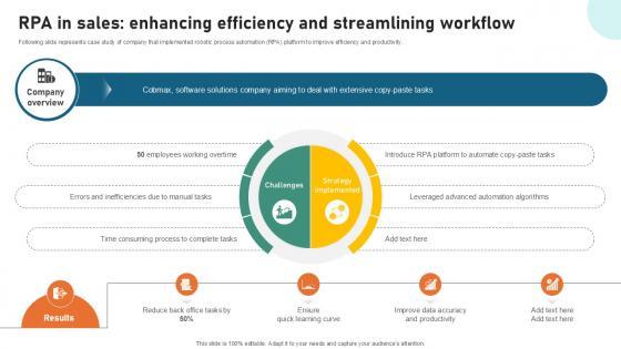 Following slide represents case study of company that implemented robotic process automation RPA platform to improve efficiency and productivity. Presenting this PowerPoint presentation, titled RPA In Sales Enhancing Efficiency Sample Pitch Deck For Video Ppt Example, with topics curated by our researchers after extensive research. This editable presentation is available for immediate download and provides attractive features when used. Download now and captivate your audience. Presenting this RPA In Sales Enhancing Efficiency Sample Pitch Deck For Video Ppt Example. Our researchers have carefully researched and created these slides with all aspects taken into consideration. This is a completely customizable RPA In Sales Enhancing Efficiency Sample Pitch Deck For Video Ppt Example that is available for immediate downloading. Download now and make an impact on your audience. Highlight the attractive features available with our PPTs. Following slide represents case study of company that implemented robotic process automation RPA platform to improve efficiency and productivity.