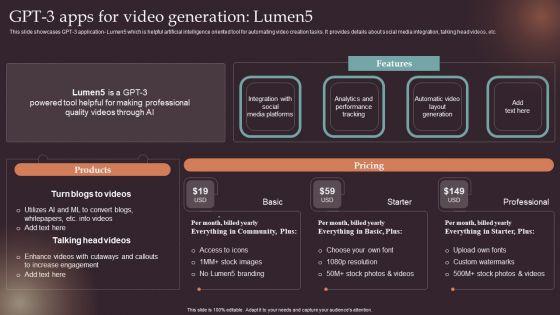 This slide showcases GPT 3 application Lumen5 which is helpful artificial intelligence oriented tool for automating video creation tasks. It provides details about social media integration, talking head videos, etc. Coming up with a presentation necessitates that the majority of the effort goes into the content and the message you intend to convey. The visuals of a PowerPoint presentation can only be effective if it supplements and supports the story that is being told. Keeping this in mind our experts created Comprehensive Resource Guide To Master GPT 3 GPT 3 Apps For Video Generation Lumen5 Themes PDF to reduce the time that goes into designing the presentation. This way, you can concentrate on the message while our designers take care of providing you with the right template for the situation.