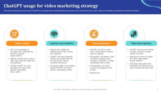 This slide showcases various use cases of ChatGPT for assisting in video marketing strategy of business. Its key elements are video scripts, captions and subtitles, personalization and video descriptions. Crafting an eye-catching presentation has never been more straightforward. Let your presentation shine with this tasteful yet straightforward ChatGpt Comprehensive Guide ChatGpt Usage For Video Marketing Strategy Ppt Template ChatGpt SS V template. It offers a minimalistic and classy look that is great for making a statement. The colors have been employed intelligently to add a bit of playfulness while still remaining professional. Construct the ideal ChatGpt Comprehensive Guide ChatGpt Usage For Video Marketing Strategy Ppt Template ChatGpt SS V that effortlessly grabs the attention of your audience Begin now and be certain to wow your customers This slide showcases various use cases of ChatGPT for assisting in video marketing strategy of business. Its key elements are video scripts, captions and subtitles, personalization and video descriptions.