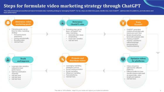 This slide showcases process that can help to formulate video marketing strategy by leveraging ChatGPT. Its key steps are determine goals, identify roles, train ChatGPT, optimize video for platforms, promote videos and track performance. From laying roadmaps to briefing everything in detail, our templates are perfect for you. You can set the stage with your presentation slides. All you have to do is download these easy-to-edit and customizable templates. ChatGpt Comprehensive Guide Steps For Formulate Video Marketing Strategy Ppt Sample ChatGpt SS V will help you deliver an outstanding performance that everyone would remember and praise you for. Do download this presentation today. This slide showcases process that can help to formulate video marketing strategy by leveraging ChatGPT. Its key steps are determine goals, identify roles, train ChatGPT, optimize video for platforms, promote videos and track performance.