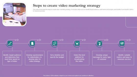 This slide showcases the steps to create video marketing strategy. It includes steps such as identify target audience, set timeline and budget, select platform and identify metrics to measure success. From laying roadmaps to briefing everything in detail, our templates are perfect for you. You can set the stage with your presentation slides. All you have to do is download these easy-to-edit and customizable templates. Steps To Create Video Marketing Strategy Effective Travel Marketing Guide For Improving Graphics PDF will help you deliver an outstanding performance that everyone would remember and praise you for. Do download this presentation today.