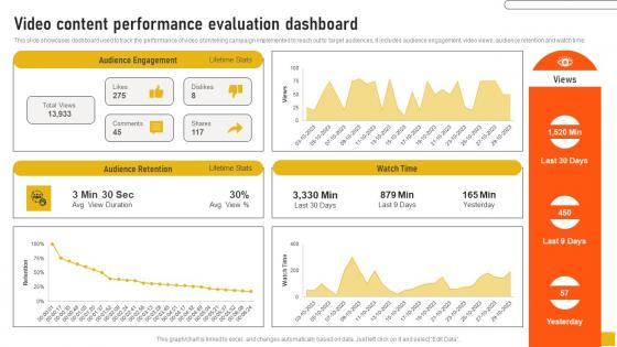 This slide showcases dashboard used to track the performance of video storytelling campaign implemented to reach out to target audiences. It includes audience engagement, video views, audience retention and watch time. Do you have to make sure that everyone on your team knows about any specific topic I yes, then you should give Comprehensive Guide For Storytelling Promotion Video Content Performance Evaluation Dashboard Download PDF a try. Our experts have put a lot of knowledge and effort into creating this impeccable Comprehensive Guide For Storytelling Promotion Video Content Performance Evaluation Dashboard Download PDF. You can use this template for your upcoming presentations, as the slides are perfect to represent even the tiniest detail. You can download these templates from the Slidegeeks website and these are easy to edit. So grab these today.