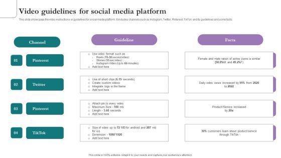 This slide showcases the video instructions or guidelines for social media platform. It includes channels such as Instagram, Twitter, Pinterest, TikTok and its guidelines and some facts. If your project calls for a presentation, then Slidegeeks is your go-to partner because we have professionally designed, easy-to-edit templates that are perfect for any presentation. After downloading, you can easily edit Video Guidelines For Social Media Platform Effective Travel Marketing Guide For Improving Professional PDF and make the changes accordingly. You can rearrange slides or fill them with different images. Check out all the handy templates