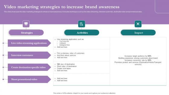 This slide showcases the video marketing strategies to enhance brand awareness. It includes techniques such as live video streaming, interview customers, destination video and promotional video. If you are looking for a format to display your unique thoughts, then the professionally designed Video Marketing Strategies To Increase Brand Awareness Effective Travel Marketing Guide For Improving Inspiration PDF is the one for you. You can use it as a Google Slides template or a PowerPoint template. Incorporate impressive visuals, symbols, images, and other charts. Modify or reorganize the text boxes as you desire. Experiment with shade schemes and font pairings. Alter, share or cooperate with other people on your work. Download Video Marketing Strategies To Increase Brand Awareness Effective Travel Marketing Guide For Improving Inspiration PDF and find out how to give a successful presentation. Present a perfect display to your team and make your presentation unforgettable.