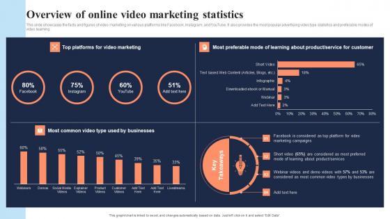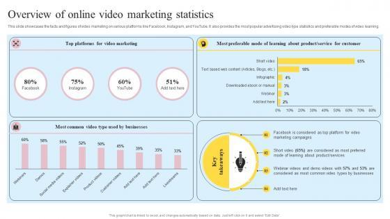This slide showcases the facts and figures of video marketing on various platforms like Facebook, Instagram, and YouTube. It also provides the most popular advertising video type statistics and preferable modes of video learning. Explore a selection of the finest Overview Of Online Video Marketing Statistics Definitive Guide On Mass Advertising Guidelines Pdf here. With a plethora of professionally designed and pre-made slide templates, you can quickly and easily find the right one for your upcoming presentation. You can use our Overview Of Online Video Marketing Statistics Definitive Guide On Mass Advertising Guidelines Pdf to effectively convey your message to a wider audience. Slidegeeks has done a lot of research before preparing these presentation templates. The content can be personalized and the slides are highly editable. Grab templates today from Slidegeeks. This slide showcases the facts and figures of video marketing on various platforms like Facebook, Instagram, and YouTube. It also provides the most popular advertising video type statistics and preferable modes of video learning.