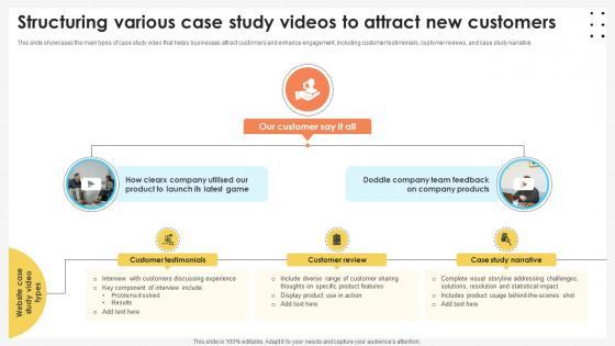 This slide showcases the main types of case study video that helps businesses attract customers and enhance engagement, including customer testimonials, customer reviews, and case study narrative. Boost your pitch with our creative Business Development Team Structuring Various Case Study Videos To Attract SA SS V. Deliver an awe-inspiring pitch that will mesmerize everyone. Using these presentation templates you will surely catch everyones attention. You can browse the ppts collection on our website. We have researchers who are experts at creating the right content for the templates. So you do not have to invest time in any additional work. Just grab the template now and use them. This slide showcases the main types of case study video that helps businesses attract customers and enhance engagement, including customer testimonials, customer reviews, and case study narrative.
