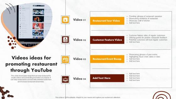 This slide showcases ideas that can help restaurant to create videos and conducting promotion on youtube. It can help restaurant to connect with potential customers and increase restaurant awareness. Get a simple yet stunning designed Online Promotional Activities Videos Ideas For Promoting Structure Pdf. It is the best one to establish the tone in your meetings. It is an excellent way to make your presentations highly effective. So, download this PPT today from Slidegeeks and see the positive impacts. Our easy to edit Online Promotional Activities Videos Ideas For Promoting Structure Pdf can be your go to option for all upcoming conferences and meetings. So, what are you waiting for Grab this template today. This slide showcases ideas that can help restaurant to create videos and conducting promotion on youtube. It can help restaurant to connect with potential customers and increase restaurant awareness.