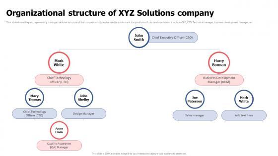 This slide shows diagram representing the organizational structure of the company which can be used to understand the positions of core team members. It includes CEO, CTO, Technical manager, business development manager, etc. Are you in need of a template that can accommodate all of your creative concepts This one is crafted professionally and can be altered to fit any style. Use it with Google Slides or PowerPoint. Include striking photographs, symbols, depictions, and other visuals. Fill, move around, or remove text boxes as desired. Test out color palettes and font mixtures. Edit and save your work, or work with colleagues. Download Organizational Structure Of XYZ Solutions Company Video Game Financing Pitch Deck and observe how to make your presentation outstanding. Give an impeccable presentation to your group and make your presentation unforgettable. This slide shows diagram representing the organizational structure of the company which can be used to understand the positions of core team members. It includes CEO, CTO, Technical manager, business development manager, etc.