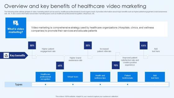 The following slide outlines glimpse of video marketing which can be used by healthcare professionals to boost organic reach. It provides information about major benefits such as higher patient engagement, brand awareness rate, etc. It also covers information about video marketing types such as healthcare professional recognition, virtual tours, etc. Want to ace your presentation in front of a live audience Our Overview And Key Benefits Of Healthcare Video Marketing Healthcare Promotion Structure Pdf can help you do that by engaging all the users towards you. Slidegeeks experts have put their efforts and expertise into creating these impeccable powerpoint presentations so that you can communicate your ideas clearly. Moreover, all the templates are customizable, and easy-to-edit and downloadable. Use these for both personal and commercial use. The following slide outlines glimpse of video marketing which can be used by healthcare professionals to boost organic reach. It provides information about major benefits such as higher patient engagement, brand awareness rate, etc. It also covers information about video marketing types such as healthcare professional recognition, virtual tours, etc.