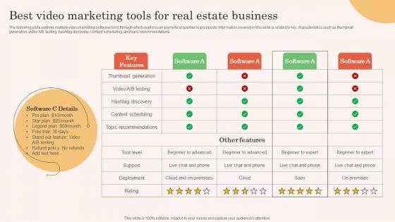 The following slide outlines multiple video marketing software tools through which realtors can promote properties to prospects. Information covered in this slide is related to key characteristics such as thumbnail generation, video AorB testing, hashtag discovery, content scheduling, and topic recommendations.Do you have to make sure that everyone on your team knows about any specific topic I yes, then you should give Best Video Marketing Tools For Business Real Estate Property Marketing Professional Pdf a try. Our experts have put a lot of knowledge and effort into creating this impeccable Best Video Marketing Tools For Business Real Estate Property Marketing Professional Pdf. You can use this template for your upcoming presentations, as the slides are perfect to represent even the tiniest detail. You can download these templates from the Slidegeeks website and these are easy to edit. So grab these today. The following slide outlines multiple video marketing software tools through which realtors can promote properties to prospects. Information covered in this slide is related to key characteristics such as thumbnail generation, video AorB testing, hashtag discovery, content scheduling, and topic recommendations.