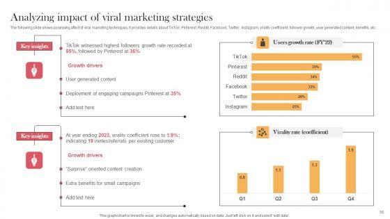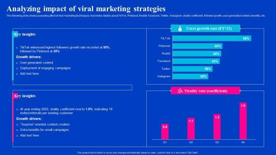 The following slide shows assessing affect of viral marketing techniques. It provides details about TikTok, Pinterest, Reddit, Facebook, Twitter, Instagram, virality coefficient, follower growth, user generated content, benefits.Are you in need of a template that can accommodate all of your creative concepts This one is crafted professionally and can be altered to fit any style. Use it with Google Slides or PowerPoint. Include striking photographs, symbols, depictions, and other visuals. Fill, move around, or remove text boxes as desired. Test out color palettes and font mixtures. Edit and save your work, or work with colleagues. Download Analyzing Impact Of Viral Marketing Strategies Viral Video Outreach Plan Inspiration Pdf and observe how to make your presentation outstanding. Give an impeccable presentation to your group and make your presentation unforgettable. The following slide shows assessing affect of viral marketing techniques. It provides details about TikTok, Pinterest, Reddit, Facebook, Twitter, Instagram, virality coefficient, follower growth, user generated content, benefits.
