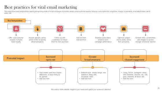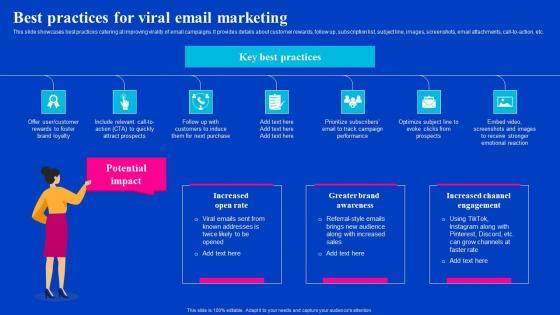 This slide showcases best practices catering at improving virality of email campaigns. It provides details about customer rewards, follow up, subscription list, subject line, images, screenshots, email attachments, call-to-action, etc. Coming up with a presentation necessitates that the majority of the effort goes into the content and the message you intend to convey. The visuals of a PowerPoint presentation can only be effective if it supplements and supports the story that is being told. Keeping this in mind our experts created Best Practices For Viral Email Marketing Viral Video Outreach Plan Guidelines Pdf to reduce the time that goes into designing the presentation. This way, you can concentrate on the message while our designers take care of providing you with the right template for the situation. This slide showcases best practices catering at improving virality of email campaigns. It provides details about customer rewards, follow up, subscription list, subject line, images, screenshots, email attachments, call-to-action, etc.