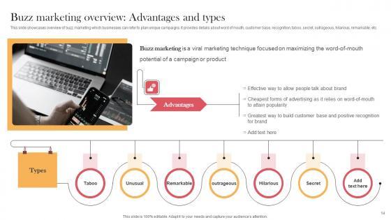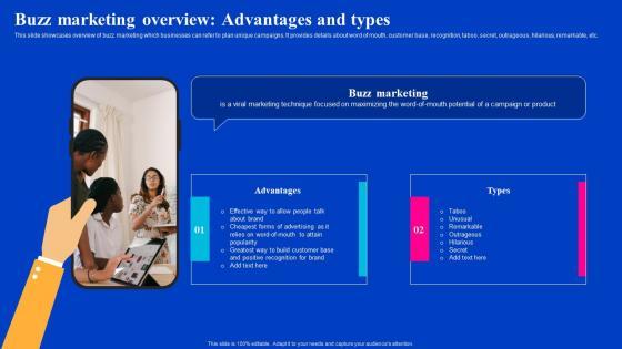 This slide showcases overview of buzz marketing which businesses can refer to plan unique campaigns. It provides details about word of mouth, customer base, recognition, taboo, secret, outrageous, hilarious, remarkable, etc. This Buzz Marketing Overview Advantages And Types Viral Video Outreach Plan Designs Pdf is perfect for any presentation, be it in front of clients or colleagues. It is a versatile and stylish solution for organizing your meetings. The product name features a modern design for your presentation meetings. The adjustable and customizable slides provide unlimited possibilities for acing up your presentation. Slidegeeks has done all the homework before launching the product for you. So, do not wait, grab the presentation templates today This slide showcases overview of buzz marketing which businesses can refer to plan unique campaigns. It provides details about word of mouth, customer base, recognition, taboo, secret, outrageous, hilarious, remarkable, etc.