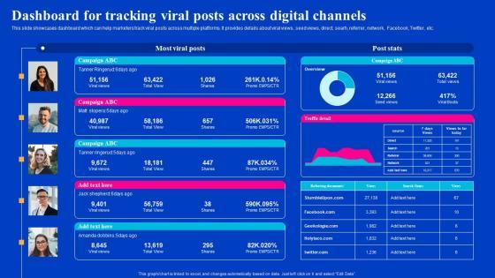This slide showcases dashboard which can help marketers track viral posts across multiple platforms. It provides details about viral views, seed views, direct, searh, referrer, network, Facebook, Twitter, etc. Explore a selection of the finest V here. With a plethora of professionally designed and pre-made slide templates, you can quickly and easily find the right one for your upcoming presentation. You can use our Dashboard For Tracking Viral Posts Across Viral Video Outreach Plan Professional Pdf to effectively convey your message to a wider audience. Slidegeeks has done a lot of research before preparing these presentation templates. The content can be personalized and the slides are highly editable. Grab templates today from Slidegeeks. This slide showcases dashboard which can help marketers track viral posts across multiple platforms. It provides details about viral views, seed views, direct, searh, referrer, network, Facebook, Twitter, etc.
