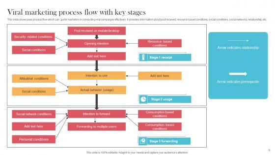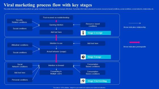 This slide showcases process flow which can guide marketers in conducting viral campaigns effectively. It provides information about post received, resource based conditions, social conditions, social networks, relationship, etc. Are you in need of a template that can accommodate all of your creative concepts This one is crafted professionally and can be altered to fit any style. Use it with Google Slides or PowerPoint. Include striking photographs, symbols, depictions, and other visuals. Fill, move around, or remove text boxes as desired. Test out color palettes and font mixtures. Edit and save your work, or work with colleagues. Download Viral Marketing Process Flow With Key Stages Viral Video Outreach Plan Guidelines Pdf and observe how to make your presentation outstanding. Give an impeccable presentation to your group and make your presentation unforgettable. This slide showcases process flow which can guide marketers in conducting viral campaigns effectively. It provides information about post received, resource based conditions, social conditions, social networks, relationship, etc.