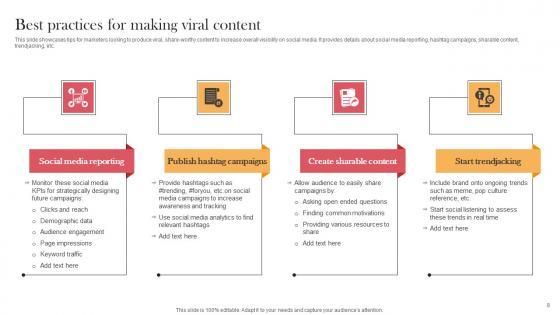 This slide showcases tips for marketers looking to produce viral, share-worthy content to increase overall visibility on social media. It provides details about social media reporting, hashtag campaigns, sharable content, trendjacking, etc. Formulating a presentation can take up a lot of effort and time, so the content and message should always be the primary focus. The visuals of the PowerPoint can enhance the presenters message, so our Best Practices For Making Viral Content Viral Video Outreach Plan Graphics Pdf was created to help save time. Instead of worrying about the design, the presenter can concentrate on the message while our designers work on creating the ideal templates for whatever situation is needed. Slidegeeks has experts for everything from amazing designs to valuable content, we have put everything into Best Practices For Making Viral Content Viral Video Outreach Plan Graphics Pdf. This slide showcases tips for marketers looking to produce viral, share-worthy content to increase overall visibility on social media. It provides details about social media reporting, hashtag campaigns, sharable content, trendjacking, etc.